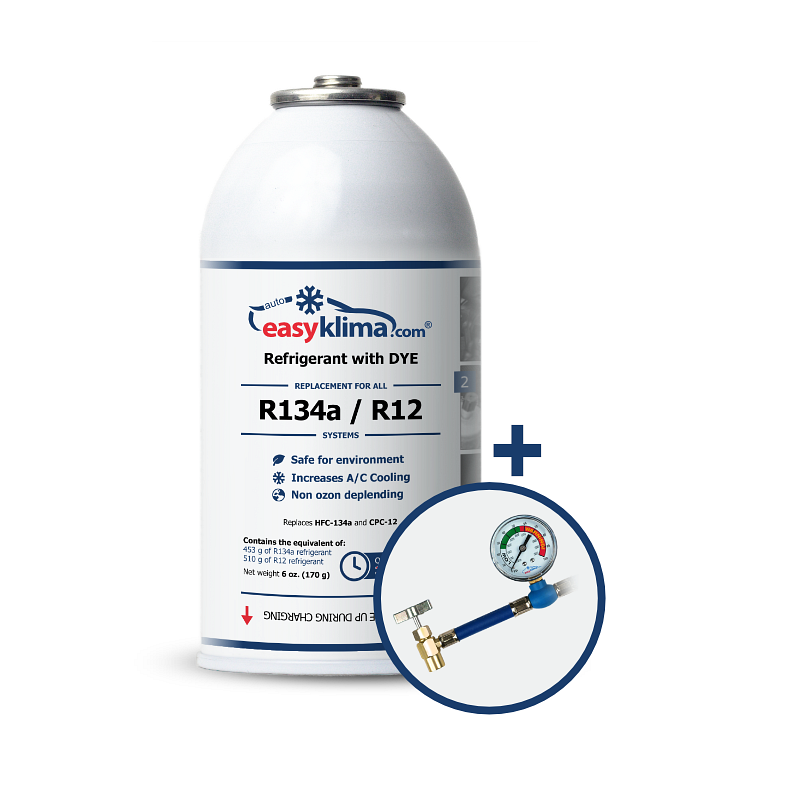 The refrigerant in your car’s air conditioning system plays a vital role—it absorbs heat from the cabin and expels it outside, keeping the inside of your vehicle refreshingly cool. Over time, however, refrigerant levels can drop due to leakage, leading to weaker cooling and increasing the risk of internal damage to your A/C components. EasyKlima offers top-tier refrigerants for automotive A/C systems, including industry-standard options like R134a and R12, R1234yf. These modern blends not only deliver excellent cooling performance, but are also environmentally friendly and safe for your system. Every EasyKlima kit comes ready-to-use and includes a pressure gauge and sealing compound—so you can easily check pressure levels and seal any leaks on the spot.